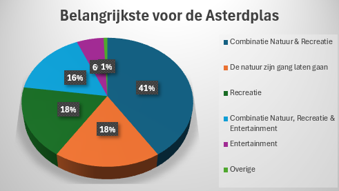 De uitkomsten van vraag 1 laten zien dat een ruime meerderheid waarde hecht aan natuur, al dan niet in combinatie met recreatie, terwijl puur entertainment slechts voor een kleine minderheid prioriteit heeft.