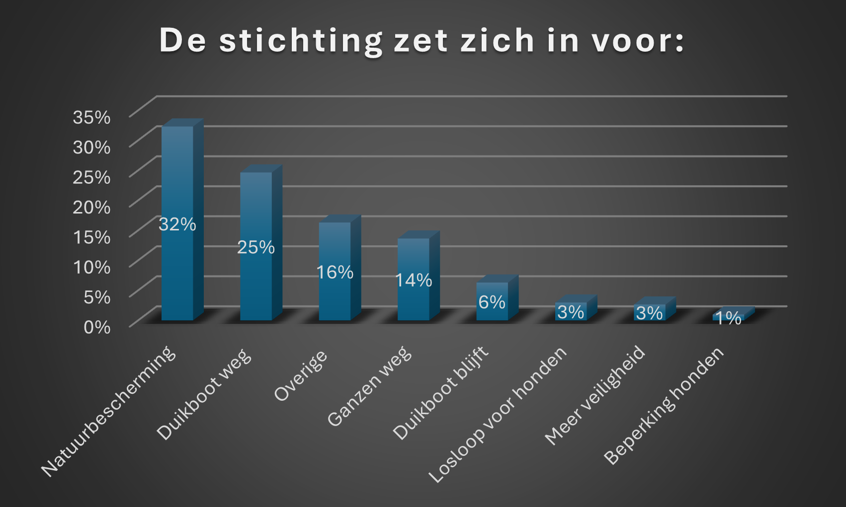 Het is opvallend dat natuurbescherming en zorgen over festival Duikboot door meer dan de helft van de respondenten als belangrijkste doelen worden genoemd. Dit geeft een duidelijke indicatie over wat er leeft onder de bewoners en waar de stichting zich in komende jaren op zou moeten richten.