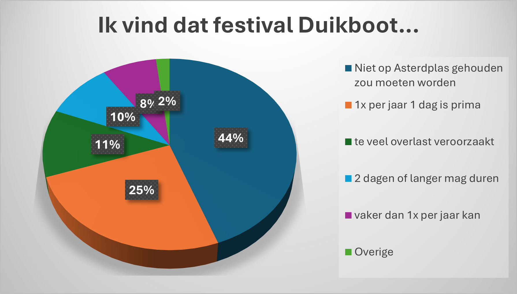 Een duidelijke meerderheid van de respondenten vindt dat festival Duikboot niet (meer) op de Asterdplas thuishoort, of slechts in sterk beperkte vorm. Dit staat haaks op de ambities van de organisatie van het festival en de ondersteuning die zij in recente jaren hiervoor van de gemeente heeft gekregen.